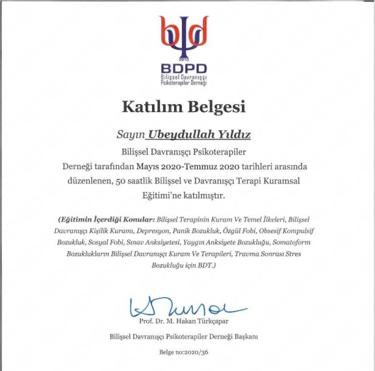 Ubeydullah beye 2,5 aydır terapiye geliyorum.Bu kadar erken sonuç alacağım aklıma gelmezdi.Bütün hayatım değişti.Ailemle ilişkilerim,hayata bakışım,çevremle kurduğum iletişim bambaşka oldu.Korkularım yerini cesarete;endişelerim kaygılarım yerini güvene bıraktı.Kendimi tanımam,hayat enerjimin yükselmesi en büyük kazancım ve bunun için teşekkür ediyorum.İyi ki varsınız.İnsan olmanın hakkını veren,saygılı,hürmetkar,işinde disiplinli en iyi yerlere ve değere sahip olmayı hakeden UBEYDULLAH YILDIZ.